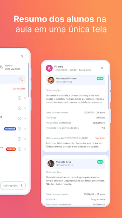 • At class time you can: see the class summary with information about the students present; give presence, absence or generate replacement; and add student evolution. This way everything will be digital and always with you.