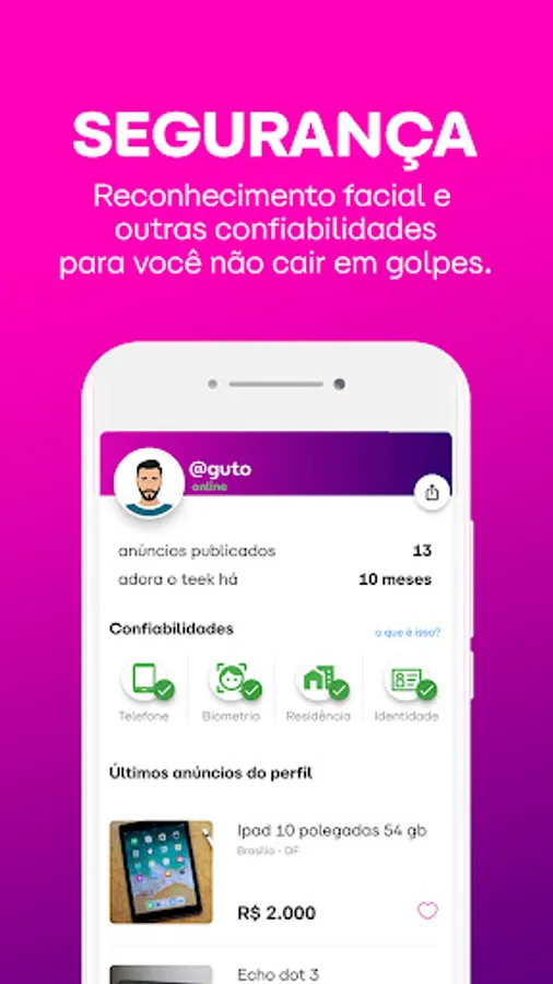 Our reliability system has facial recognition, document validation, telephone, email, among others. For each trustworthiness, the user earns a trust seal and you decide who you want to do business with.