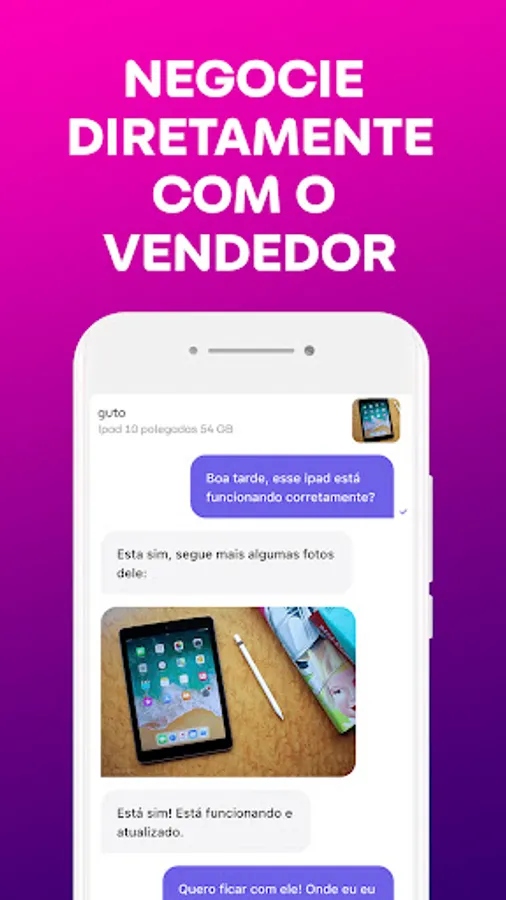 Download the app, search for products and contact the seller directly. You combine the value, payment method and delivery, without intermediaries and without fees.