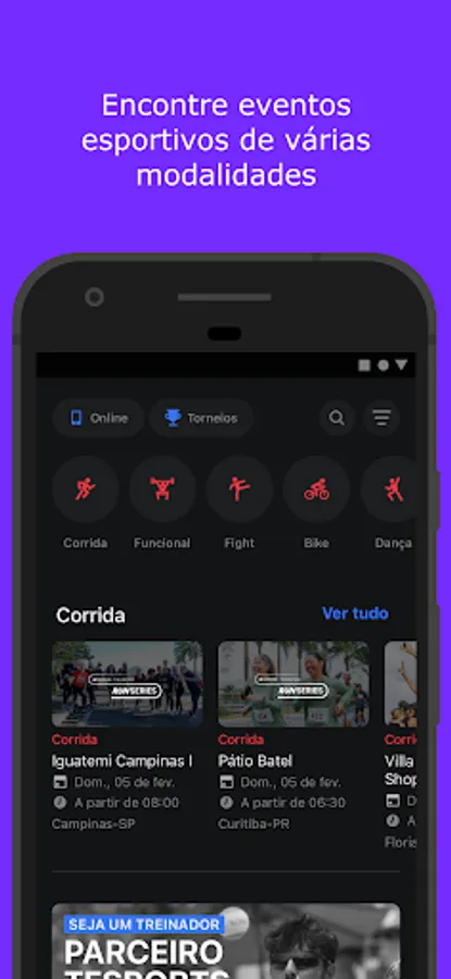 Get access to classes and events, with the best coaches, wherever and whenever it is most convenient for you. Yoga, functional, pilates, dance, fights, running: there are several modalities available, online or in person. Choose yours and make the appointment. And if you prefer something more personalized, you can request sessions with accredited coaches, right through the app.
