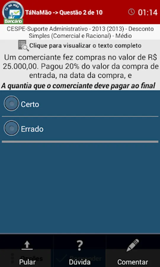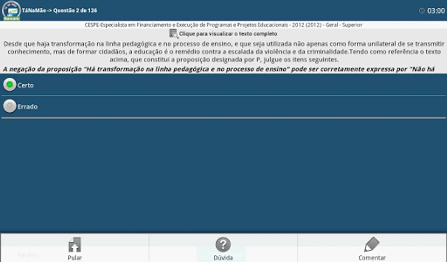 To facilitate studies to contest the Tá In Hand tool for mobile phones and tablets, Android whose main function is to provide questions for various subjects, competitions, stalls and different positions.