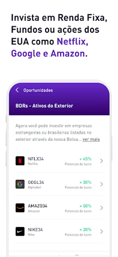 - Investments in large global companies such as Google, Apple, Amazon and Disney via BDRs.
