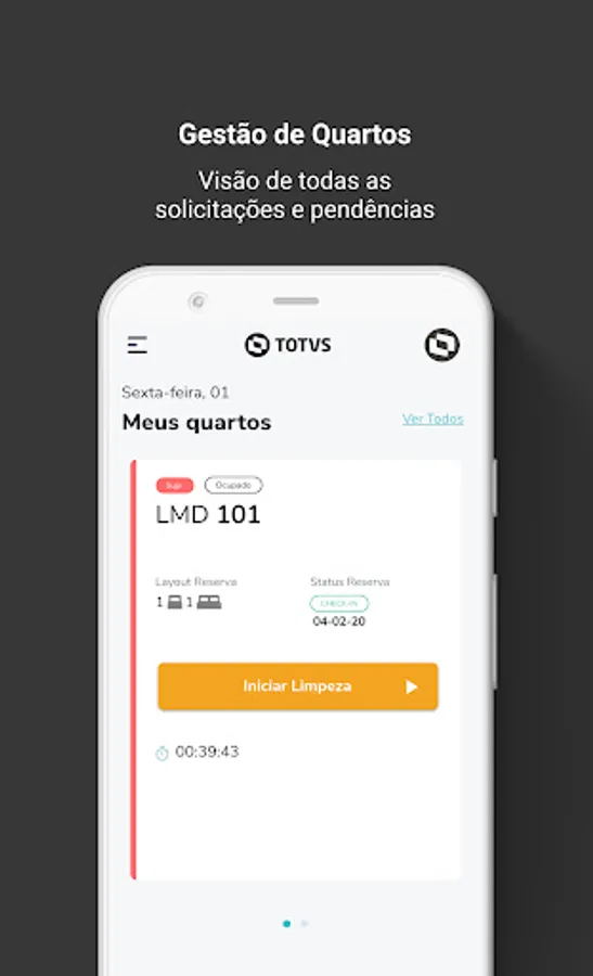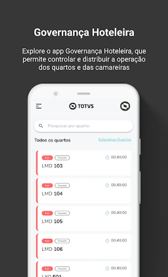 TOTVS Hospitalidade Governança Hoteleira is a tool integrated to the Hospitalidade PMS that promotes greater flexibility in the management of hotel governance through the app, which can be used on different devices to keep the hotel's governance always up to date.