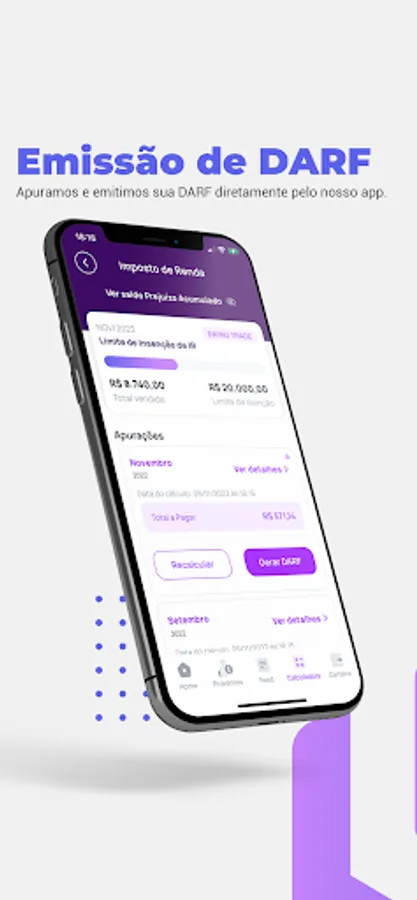 We carry out the monthly calculation of the Income Tax for you and issue your DARF within the TradeBox itself. And we've already left everything ready for when you go to make the Annual Income Tax Declaration (DIRPF).