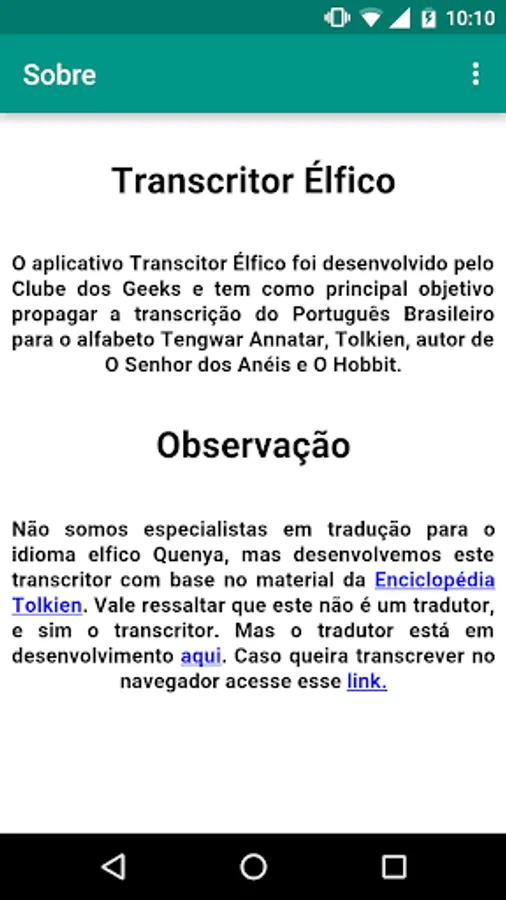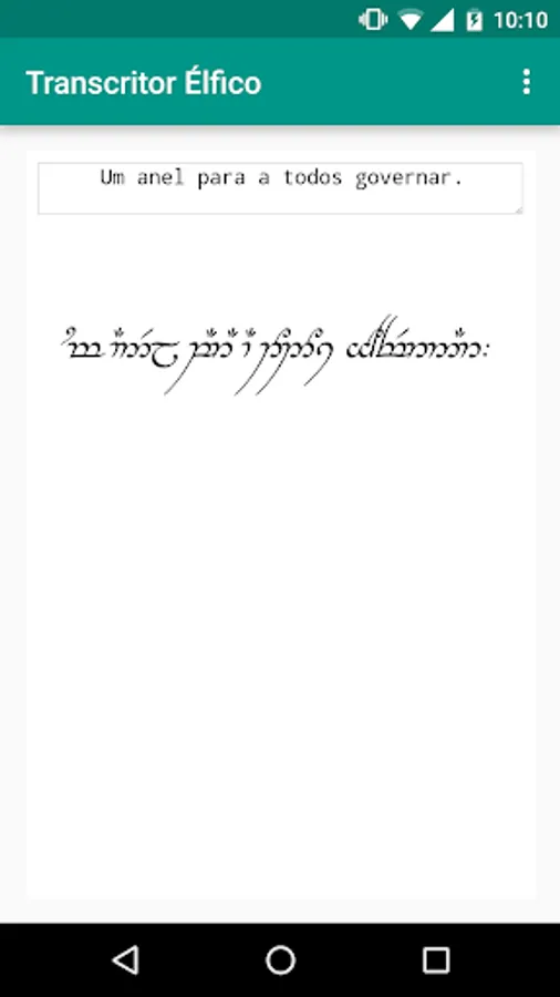 The Transcitor Elvish application was developed by the Club of Geeks and aims to spread the transcript of Brazilian Portuguese for Tengwar alphabet Annatar, Tolkien, author of Lord of the Rings and The Hobbit.