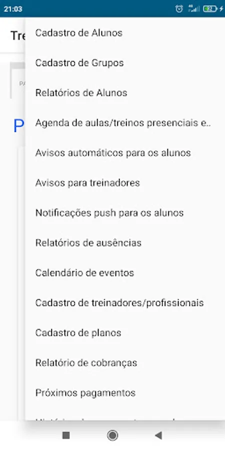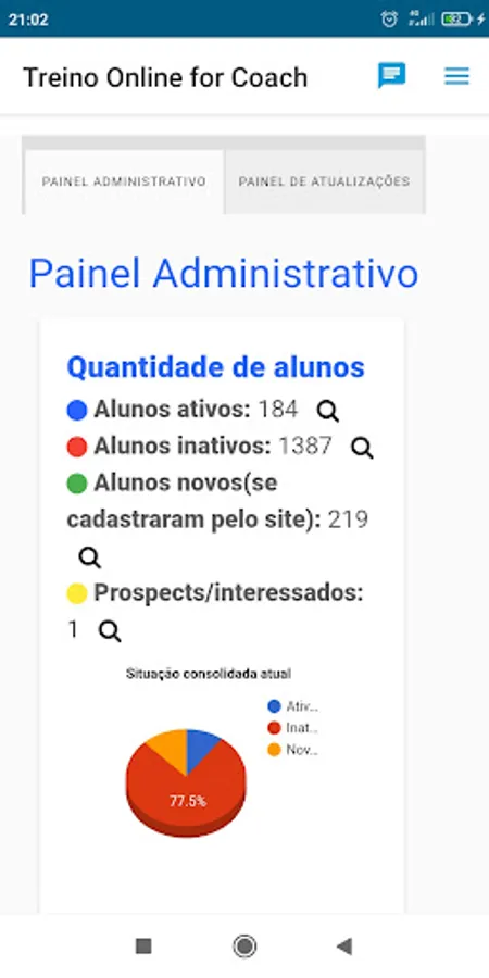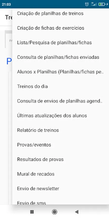App for coaches to access the Online Training system with features such as: consulting daily training sessions, creating and consulting complete training worksheets, registration and consultation of students, registration of attendance at training, registration and consultation of evaluations, registration and consultation of anamnesis, sending a push message to the students' app, registration of new interested students, among others.