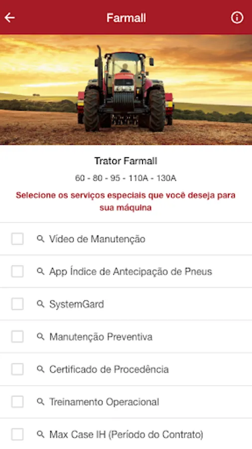 Case IH offers four types of maintenance plans. In this way, the application helps the rural entrepreneur to choose the program that is best for his machine and request a more personal contact according to the data of his machine.