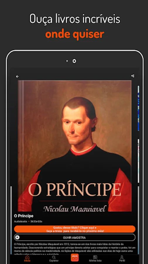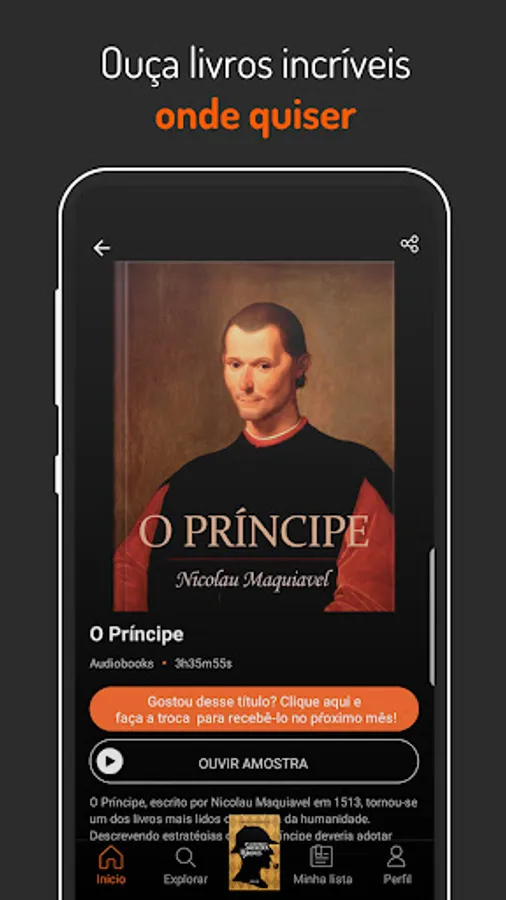 Não gostou do livro sugerido? O primeiro livro não pode ser substituído, mas depois você pode trocar por outro até a próxima data de entrega que é informada nos detalhes de sua assinatura em ‘Minha conta’. Ouça prévias dos livros disponíveis em seu plano e escolha qual quer receber no mês seguinte.