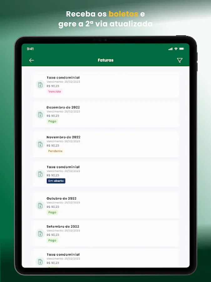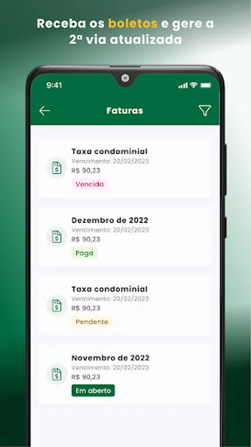 • INVOICES: Receive the condominium fee through the app and copy the bar code to pay in your internet banking. Did you win? No problem: just generate the 2nd copy and pay on time.