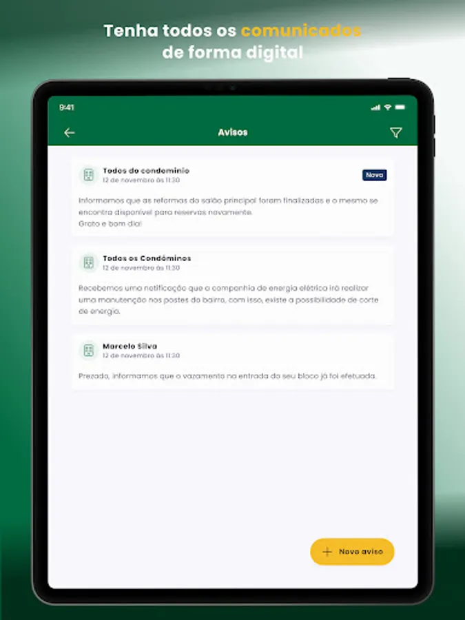 • NOTICES: Say goodbye to paper notices by elevator! Communication between everyone in the condominium can be done in real time, in an integrated and fast environment.