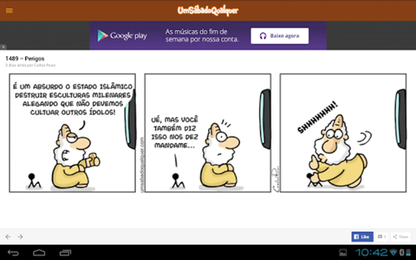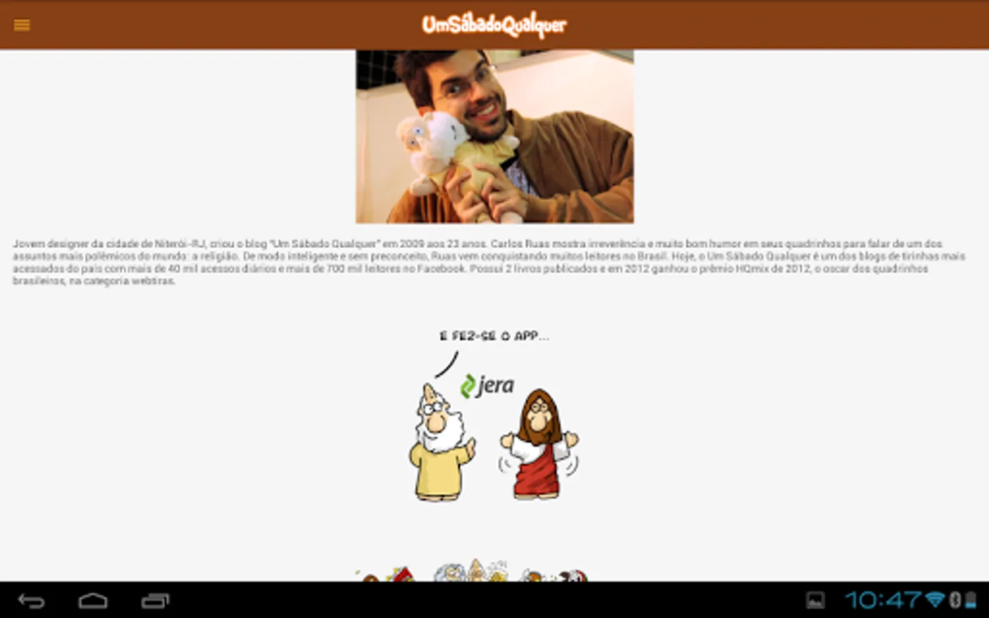 A Any Saturday is a comic strip created by Charles Streets blog with daily updates. Through a mood light, the author explores the humorous side of life, from the very moment that God experiences "create the world." The situations become increasingly complicated with the emergence of Adam, Eve, Cain, Pope, Jesus, Noah, Freud, Darwin and many others ...