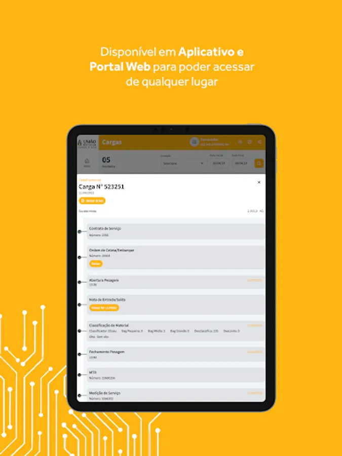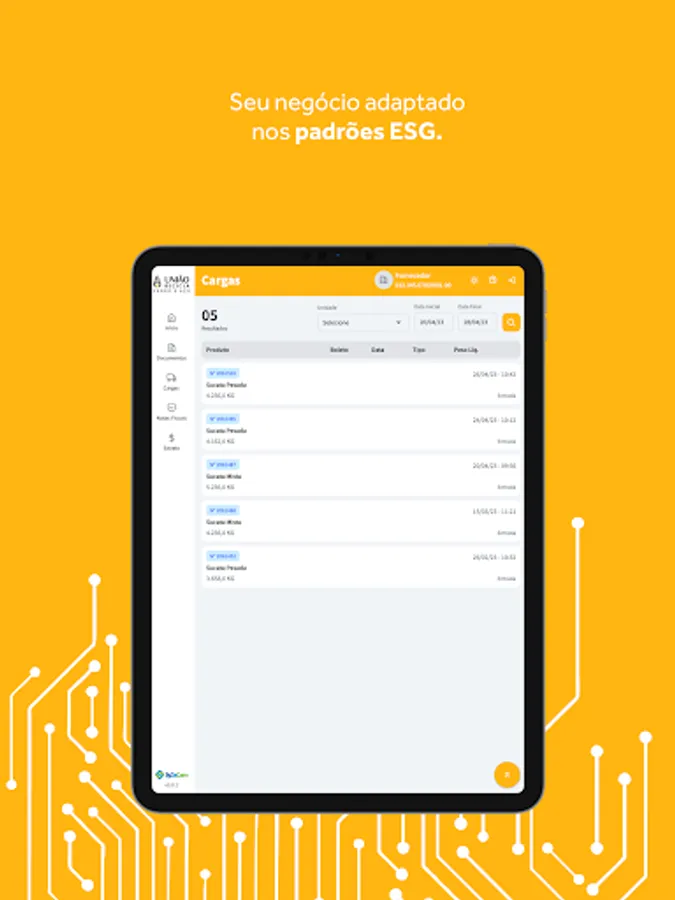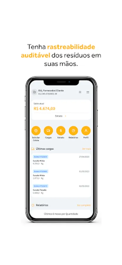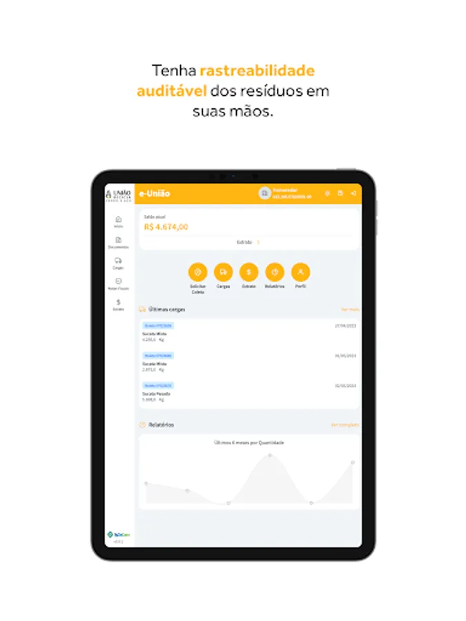 In the União Supplier app, you, who are a União Recicla supplier, have access to your load history, invoices, cargo traceability, checking account statement, access to Union documents and reports on your loads.