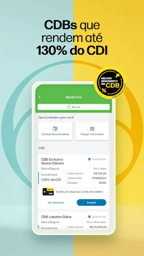 We have CDBs that yield more than twice the savings and with daily liquidity, direct treasury, investment funds with cashback, shares and much more that are available to Individuals and Legal Entities!