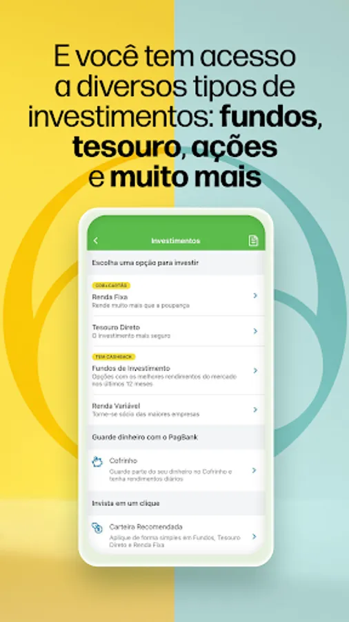Invest in CDBs that yield more than twice the savings and with daily liquidity, direct treasury, investment funds with cashback, shares and much more in the app.