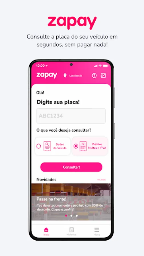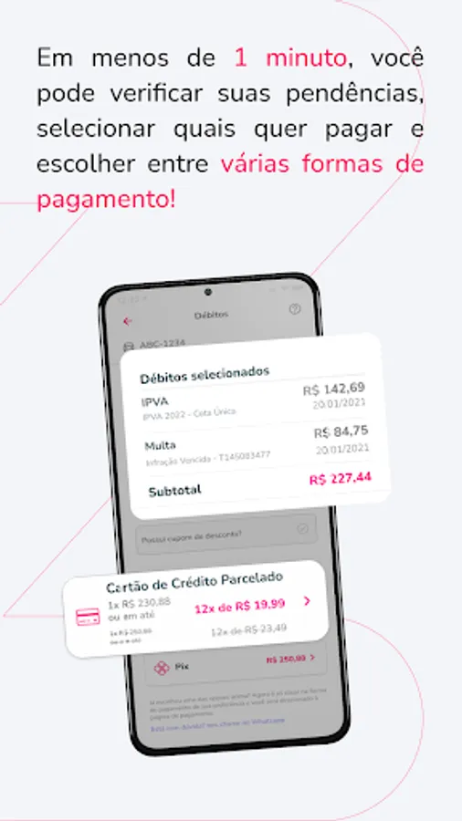 Just access our app, check your vehicle license plate and that's it, you'll have access to your IPVA 2023 and IPVA Late so you can pay as you wish: