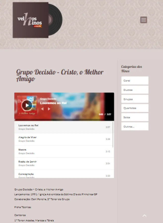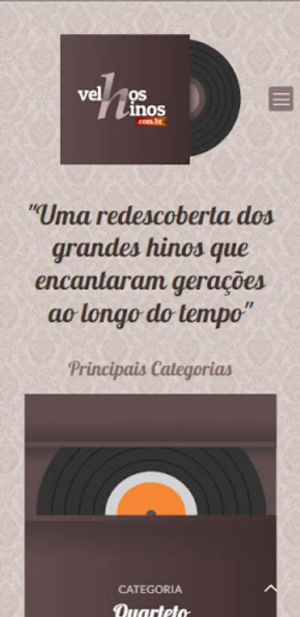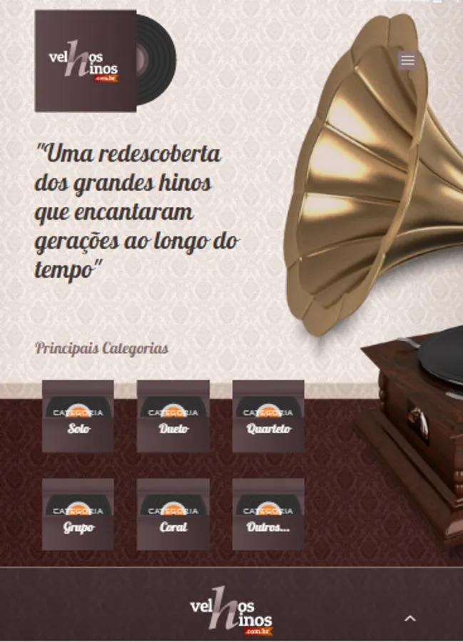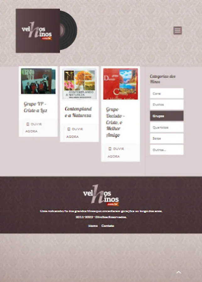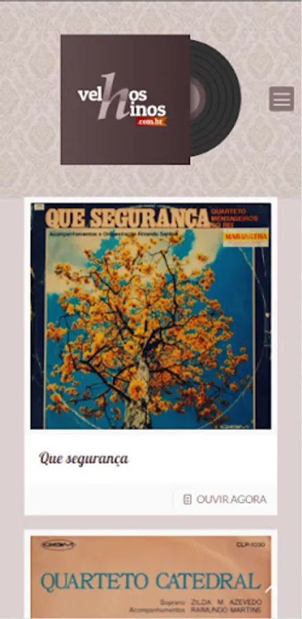 With the initiative of WGOSPEL.COM, VELHOSHINOS.COM.BR receives the APP version. With a simpler navigation, it offers you an amazing experience of listening to ancient hymns (GOSPEL), sung by Groups, Quartets, Solos and Others.