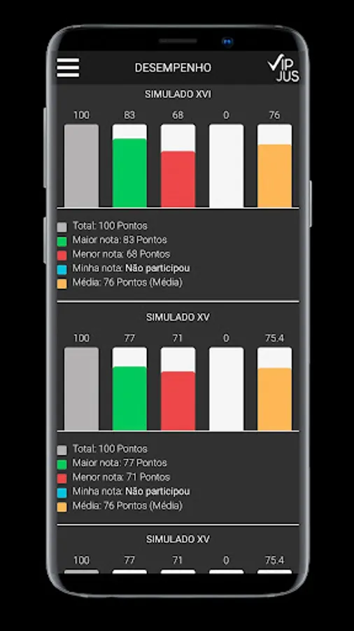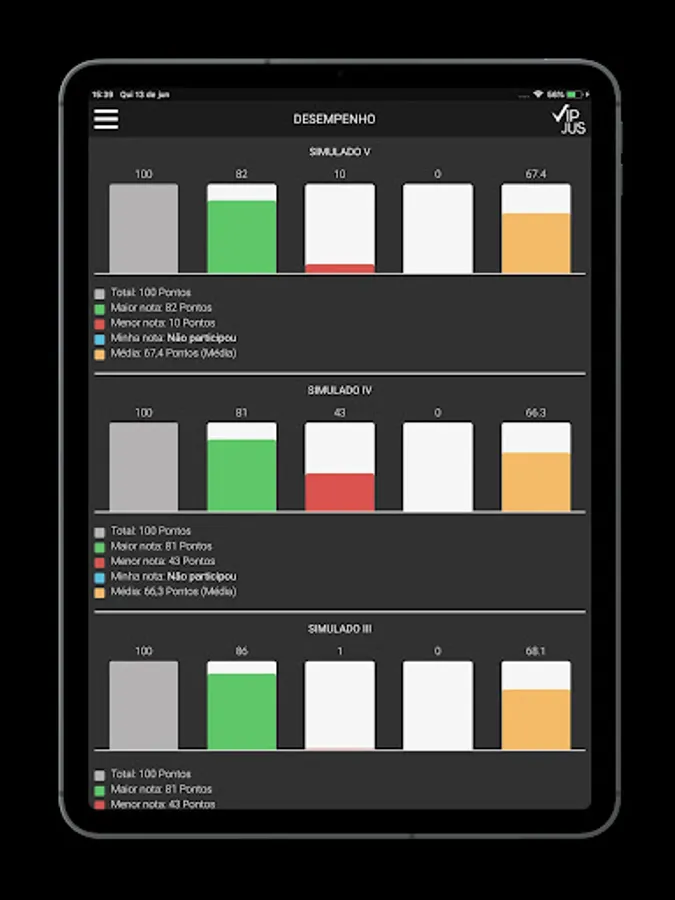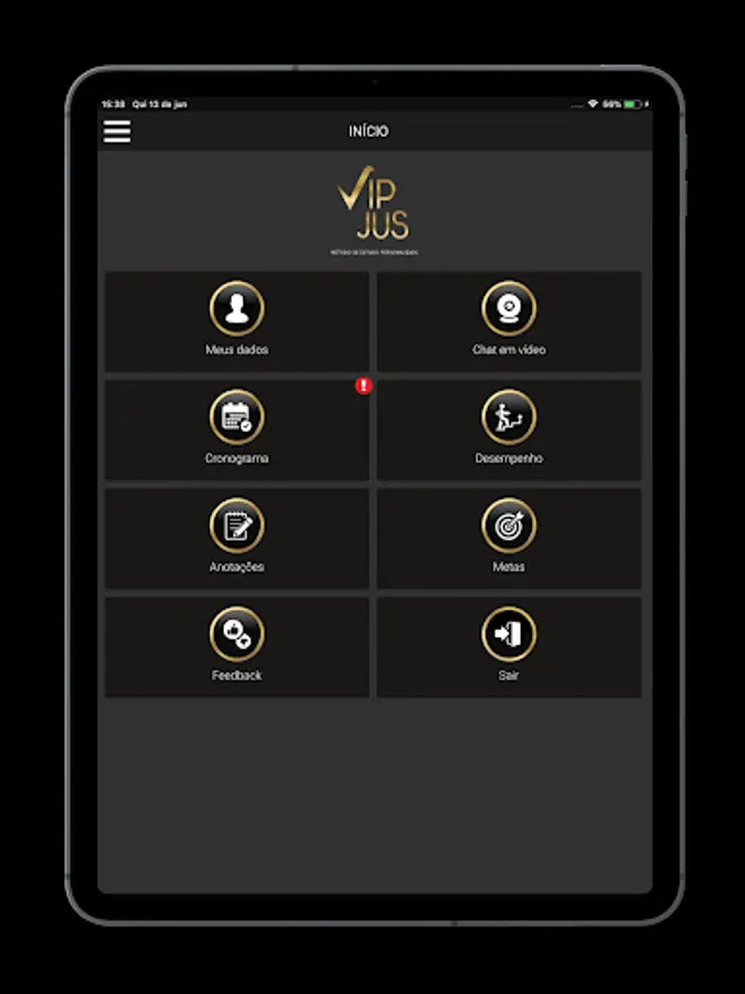 VIPJUS is a different study tool of all that exists in the courses and legal procurement market. Has what others do not have: individuality. With an own custom dynamic to open, from a method, analyzing the difficulties, needs and goals of your student VIPJUS traces the path that must be pursued until the approval in their first contact, preparing it for all the steps required for your desired career. In this app, the student has access to their weekly schedules of individual study, its control targets (new), to your notebook (novelty), the analysis of their individual performance and compared to the other students, to your channel live chat and online with our teachers, to chat with the other students and the feedback area - channel where our teachers possibly send tips and messages linked to their performance in the course. The app is unique to this VIPJUS students (personalized study method) to access your private content and such support tools and performance improvement mapping.