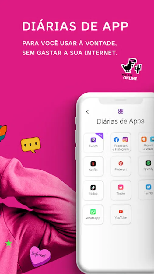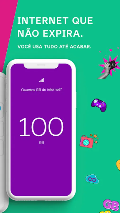 Choose from 1 to 100GB that do not expire, voice and SMS minutes to talk at ease with any operator in Brazil, choose the apps you use the most and use them for a whole day without spending your internet. And if you want to change any choice, it's easy: just do it through the app