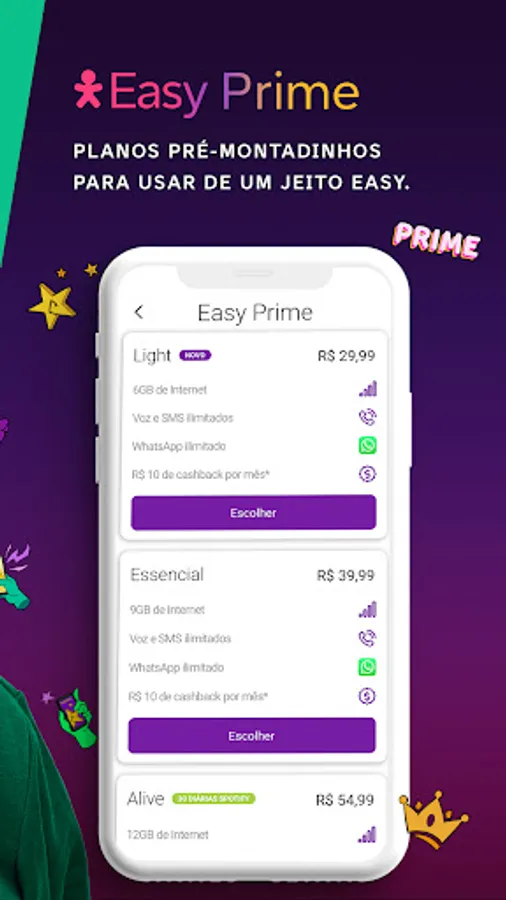 For that, there is Vivo Easy Prime, pre-assembled plans with the flexibility of Vivo Easy: you have internet, monthly cashback to use in the app, unlimited WhatsApp + Voice + SMS"