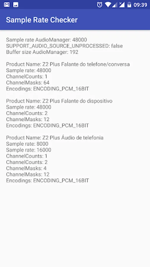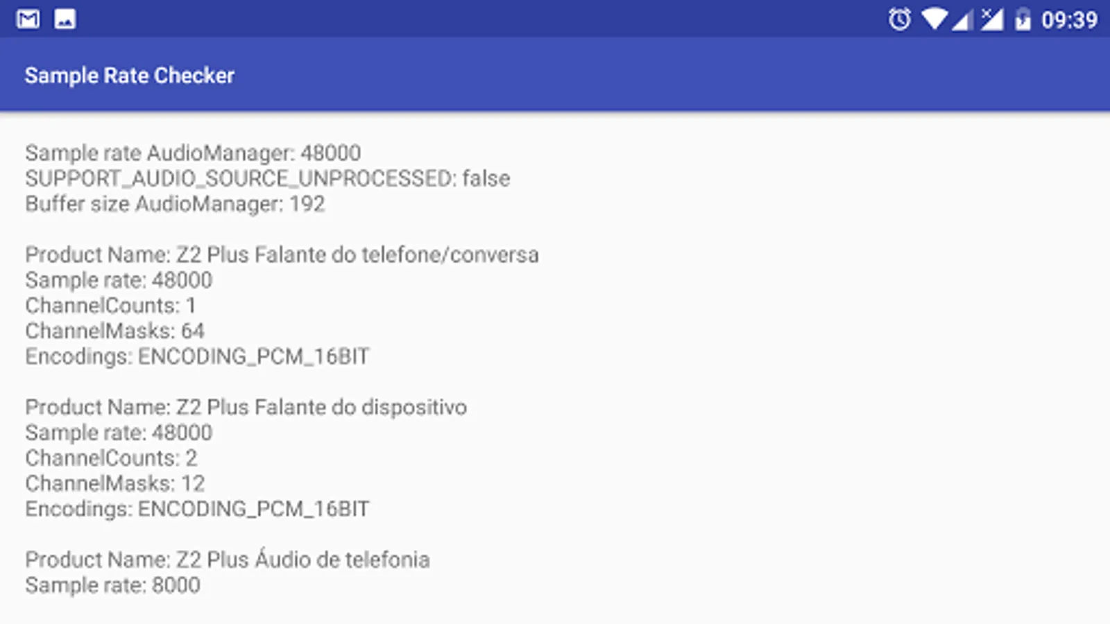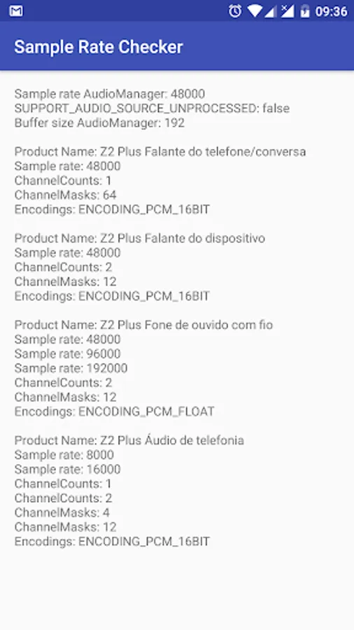 The Sample Rate Checker displays a list of the device's audio output devices with their respective settings data available for audio playback.
