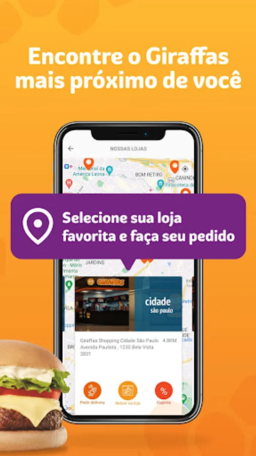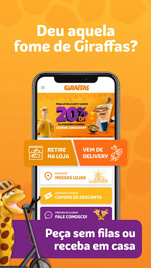 With the new Giraffas app, you have much more convenience to place your orders in our stores! From your mobile phone, you request a delivery and receive your favorite dish or snack from the comfort of your home or, if you prefer, advance your order through the application and take it off hot on the counter of the store without queuing.