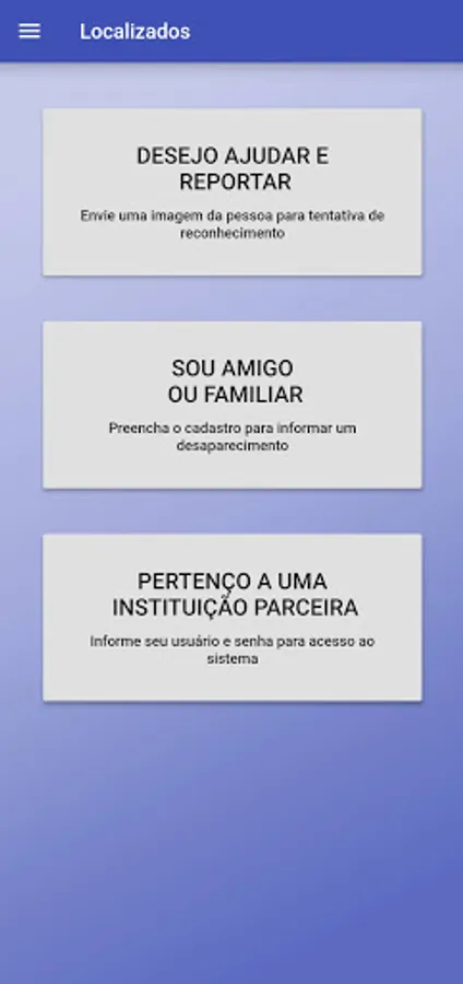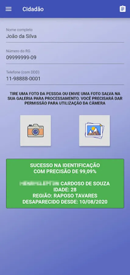 If you are a citizen and want to collaborate in the identification of a missing person in your work or social center, download the application, and send a photo for research in our database. The uploaded photos are not stored and are only used for verification against our database.