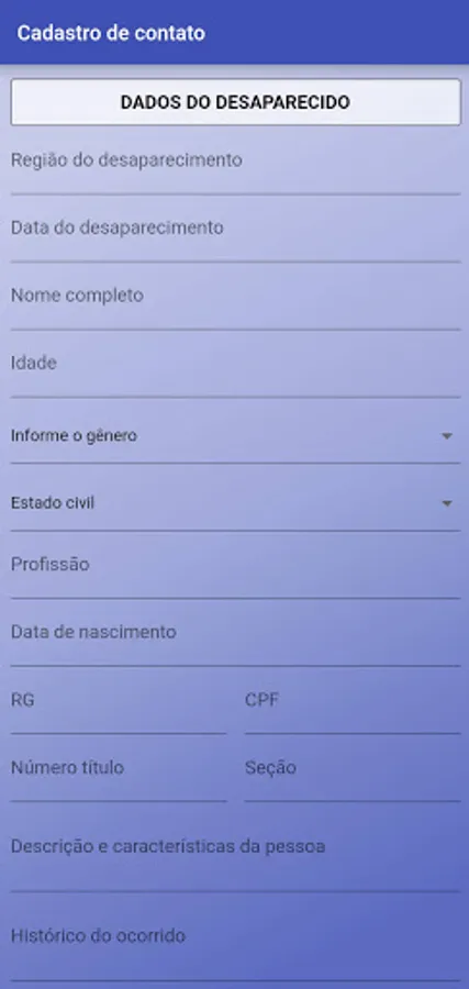 If you have a friend or family member who is missing and you want to register the occurrence of the disappearance in our database, just fill in the information about the occurrence and send the photos you have of the missing person.