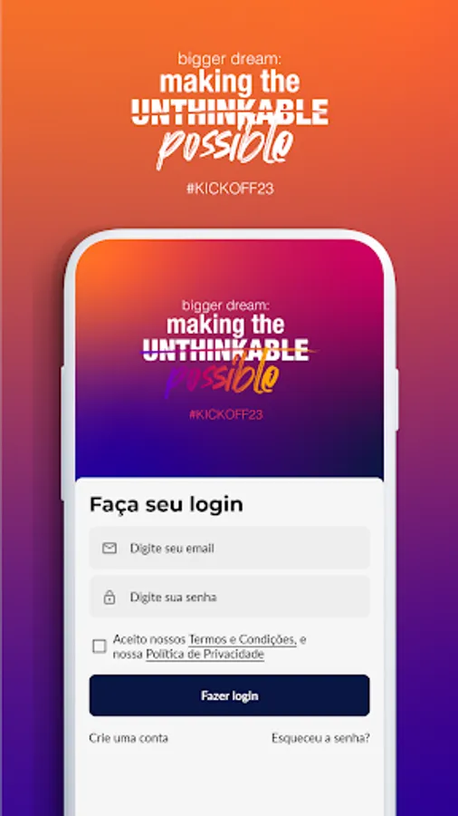 Come make the unimaginable possible! With the Stefanini KICK OFF 2023 app, your event starts now. You can make new contacts, get to know the event spaces, send questions to speakers, exchange messages with other participants and interact with the community. In addition, you can consult the schedule, evaluate content, give feedback and answer quizzes. Use the APP and have the KICK OFF 2023 in the palm of your hand.