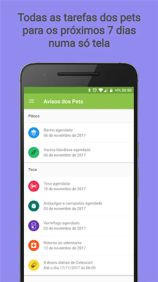 To facilitate the tasks of all pets scheduled for the next 7 days, starting from the current date, they are displayed on a warning screen so that you can program yourself so you don't forget anything, and if you forget, don't worry, you will be notified .