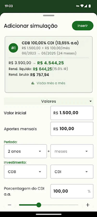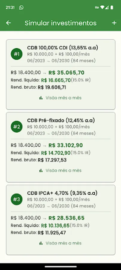 • Simulate and Compare investments in Fixed Income (CDB, LCI, LCA, CRI, CRA) with IPCA+, CDI and pre-fixed returns.