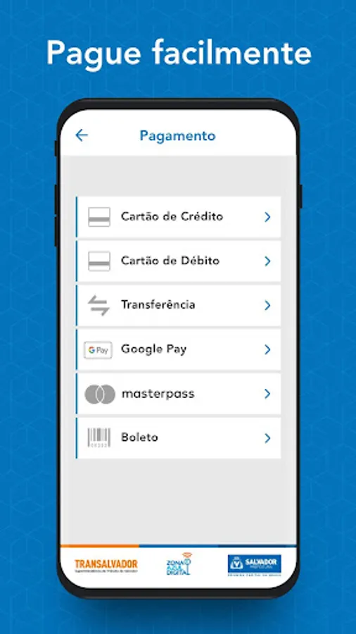 Buy the card for Zona Azul Digital and park in Zona Azul spots in Salvador , paying as you prefer and quickly and safely. The ZUL Zona Azul Digital Salvador app accepts payment via Credit , Debit , Transfer , Boleto , Masterpass and Google Pay ! ;-)