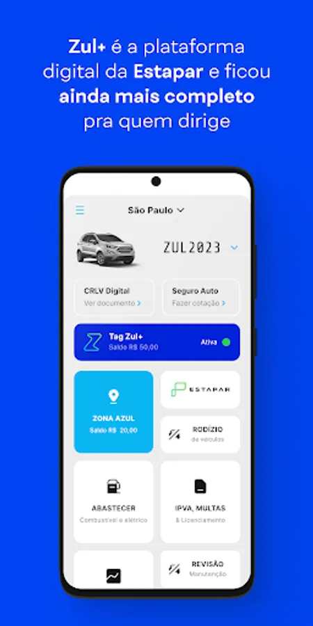 Zul+ is the complete app for those who drive. Have parking available in São Paulo and in 21 other cities, payment of IPVA, fines and licensing fees up to 12 installments, toll tag and much more!
