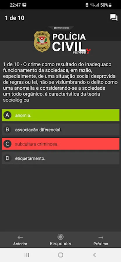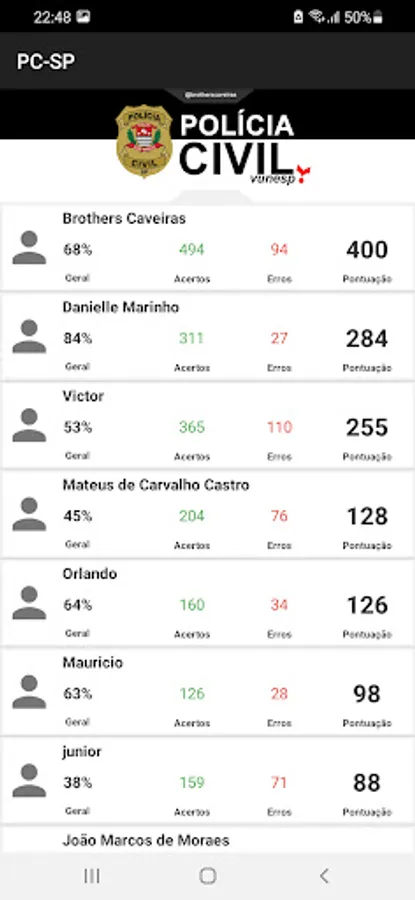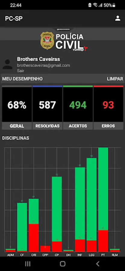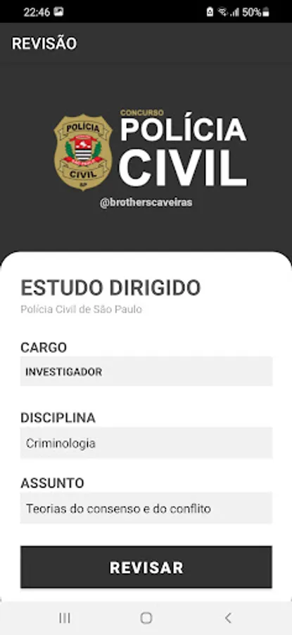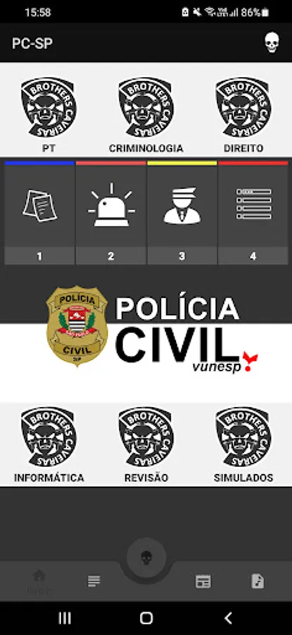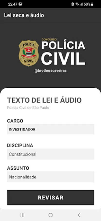 Question app focusing on the Civil Police of SP (Vunesp bank), simulations, most charged articles, audio legislation and several tips.