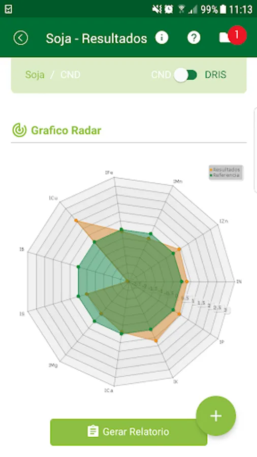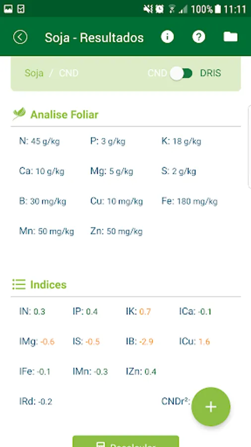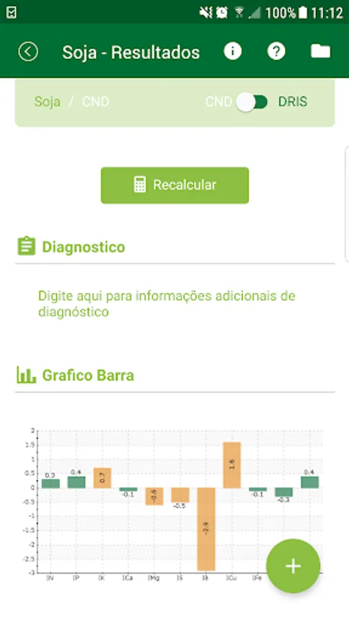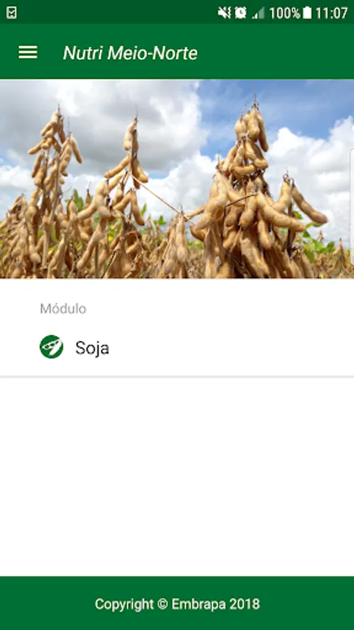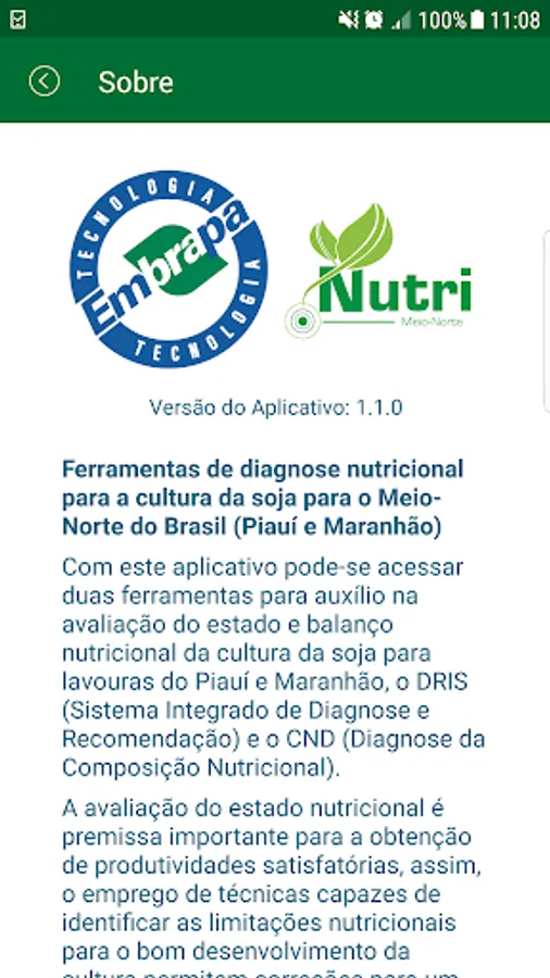The application Meio-Norte Nutri was developed with the objective of being a platform with several modules (different agricultural crops) for evaluation and leaf diagnosis using nutritional balance tools. The first version to be presented was conceived with the creation of a database of crops representative of the Mid-North Region with the analysis of vegetal tissue of the diagnostic leaf (macro and micronutrients) and the survey of the productivity of fields of commercial areas cultivated with soybean (Glicine max) from the states of Piauí and Maranhão - Nutri Meio-Norte: Soybean module. The DRIS (Integrated Diagnosis and Recommendation System) and CND (Nutrition Composition Diagnosis) methods, which relate the nutrients and their interactions, were used for the database with the information mentioned (plant tissue analysis and productivity) presenting indexes of each macro and micronutrient in relation to a reference population, that is, the norms generated come from crops of high productivity, the nutrient balance index or unbalance of the sample is presented, and it is possible to verify the most nutrient excessive or deficient.
