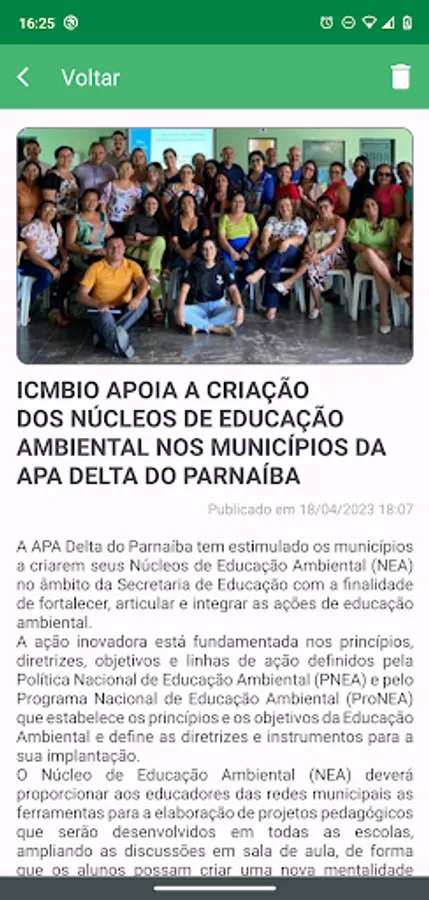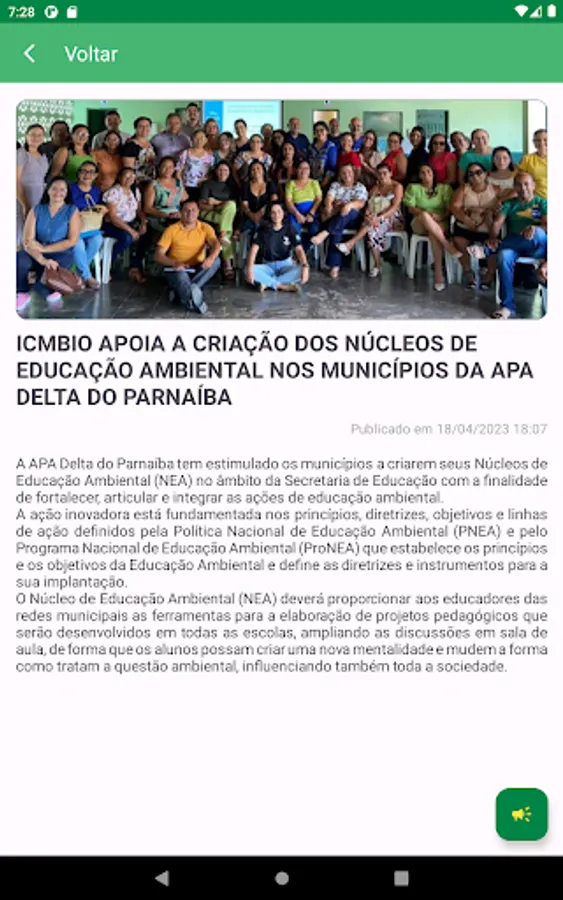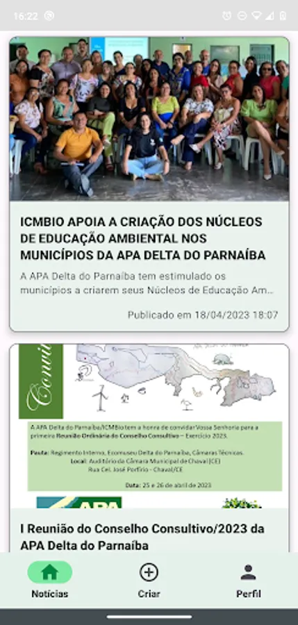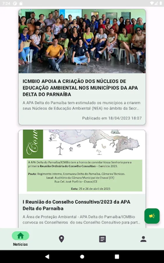 The APA Delta do Parnaíba - ICMBio application is developed at the Laboratory of Innovations and Research in Informatics (LiPi) and Innovation Factory, both at the Federal Institute of Maranhão (IFMA) - Campus Araioses. The application aims to facilitate communication between the participants of the Consultative Council of the APA Delta do Parnaíba, the Municipal Environmental Councils of that territory and the general population. The application has news feed features, information about the territory, and a feature to make complaints.