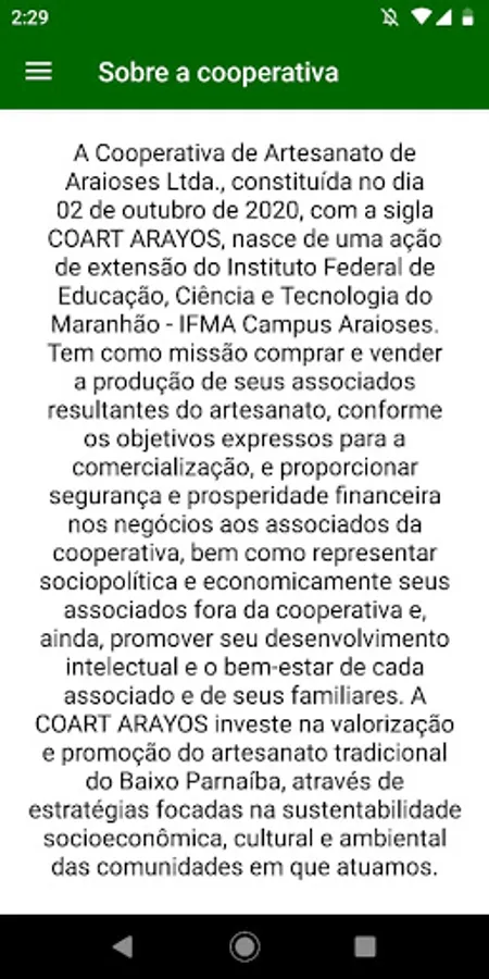 Arayos Artesanato is the market place application of the Araioses handicraft cooperative, COART ARAYOS. In the application it is possible to know various products produced by our artisans and to contact them directly for purchase.