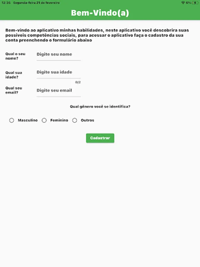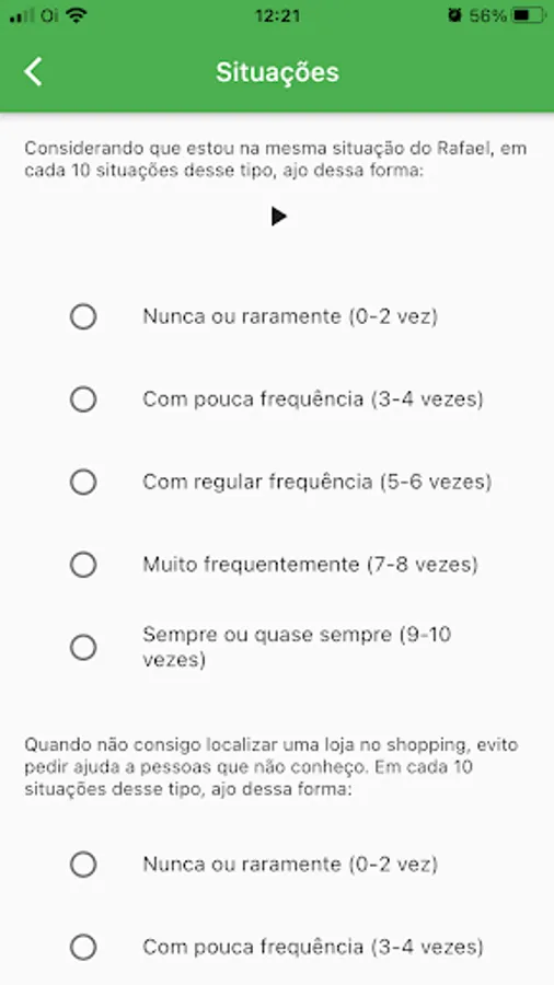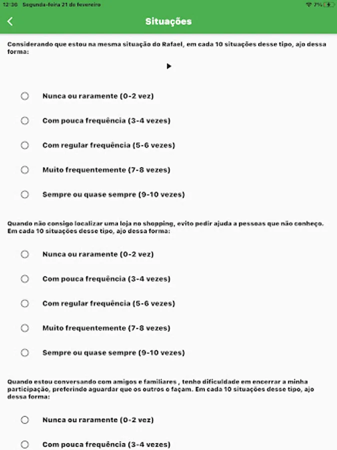 This application serves as an assessment for the user to develop social skills through questions and situations which, depending on the user's response, returns a diagnosis of social skills. Helping psychiatrists and psychologists.