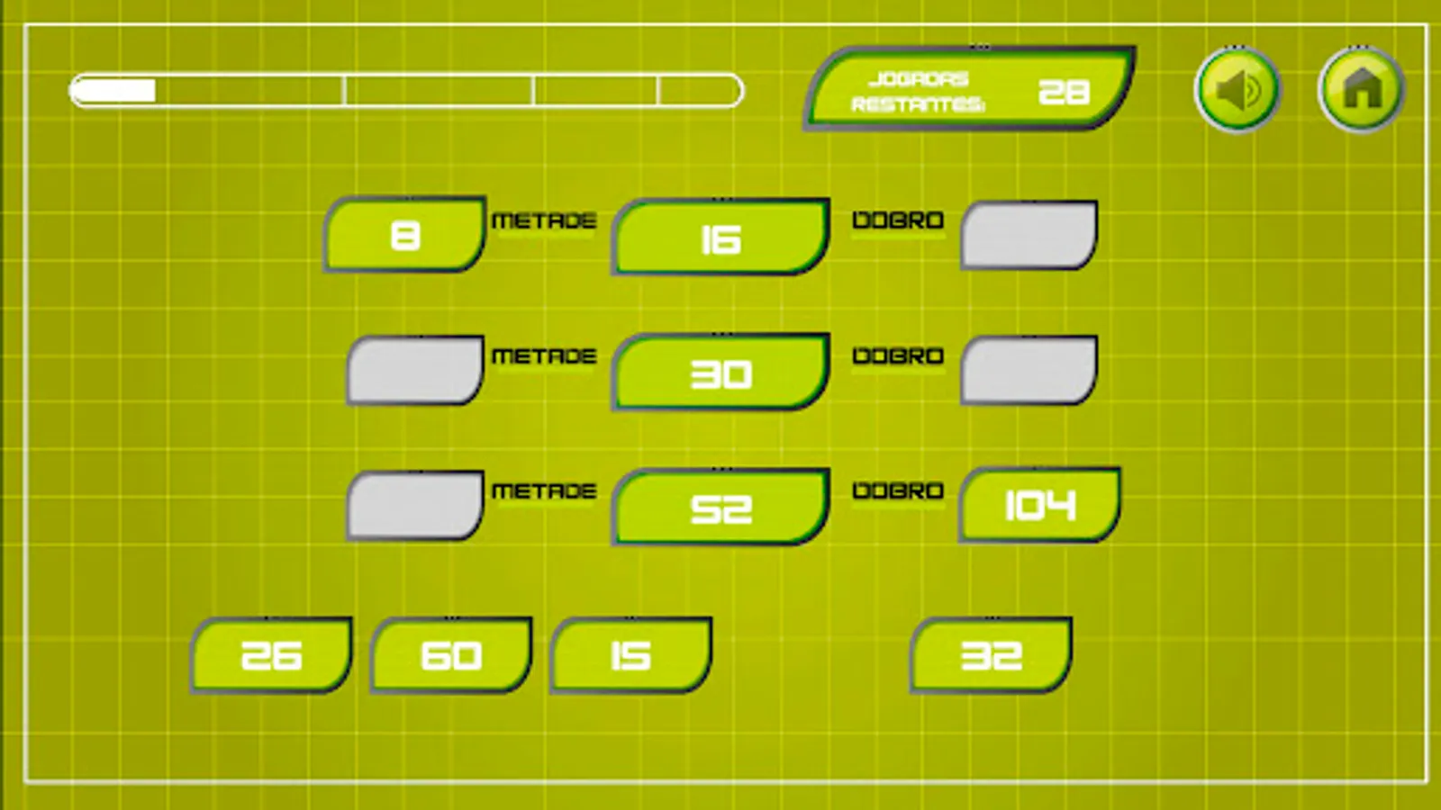 Metade e Dobro is an auxiliary mathematical game for the thematic unit of Numbers of the National Common Curricular Base (BNCC), with problems involving meanings of half and double, having to relate the corresponding numbers.