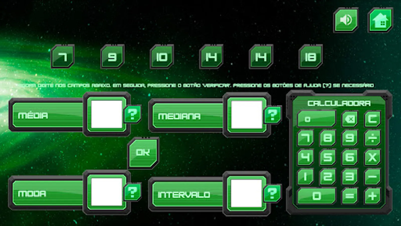 How to play: You must indicate the mode, mean, median and range of the presented list. A calculator will be available for you to carry out the calculations you deem necessary. When you finish filling in the fields, click on “ok” in the center of the screen to check the results.