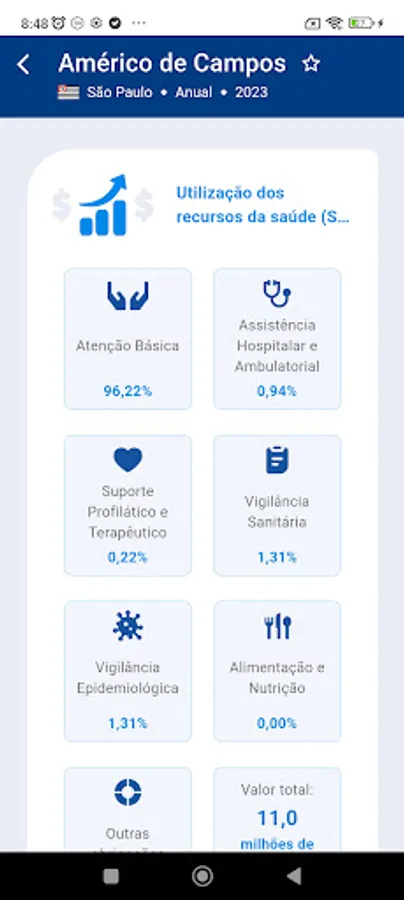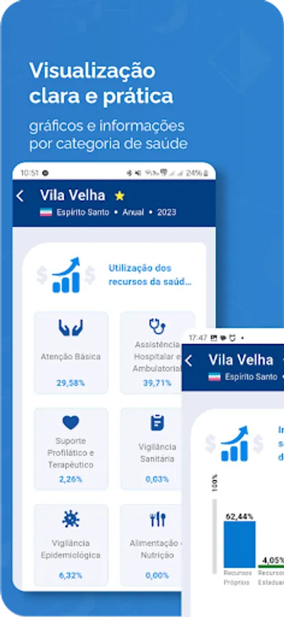 Clear and practical visualization: Monitoring of investments in SUS, with graphs and information by health category, such as primary care, hospital care and epidemiological surveillance.