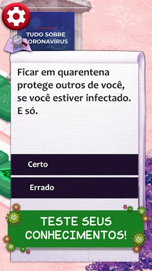 It is aimed at health professionals (doctors, physiotherapists, psychologists, nurses), patients diagnosed with the disease and the general population. Its dynamics are based on the answers (right or wrong) that the player gives when asked about the most diverse topics related to the coronavirus, and the disease it causes, Covid 19. Winning the game, then, depends on getting more than right err. The player can choose to play in the GENERAL section (for ADULTS) or in the FAMILY section (for CHILDREN).