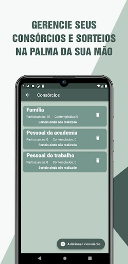 With geCon you can create groups of people to carry out a consortium and/or a raffle, intended for example to form a common savings account which would be used by all the participants in the group to purchase the desired good and/or service in an order defined by lottery.