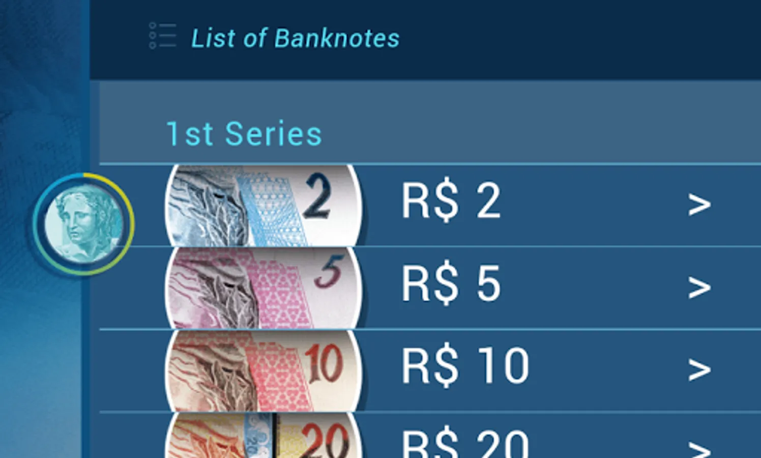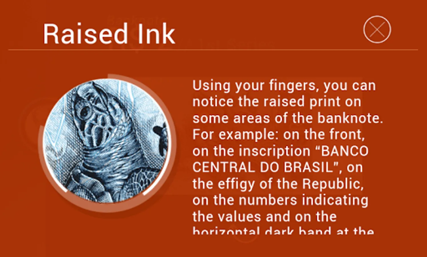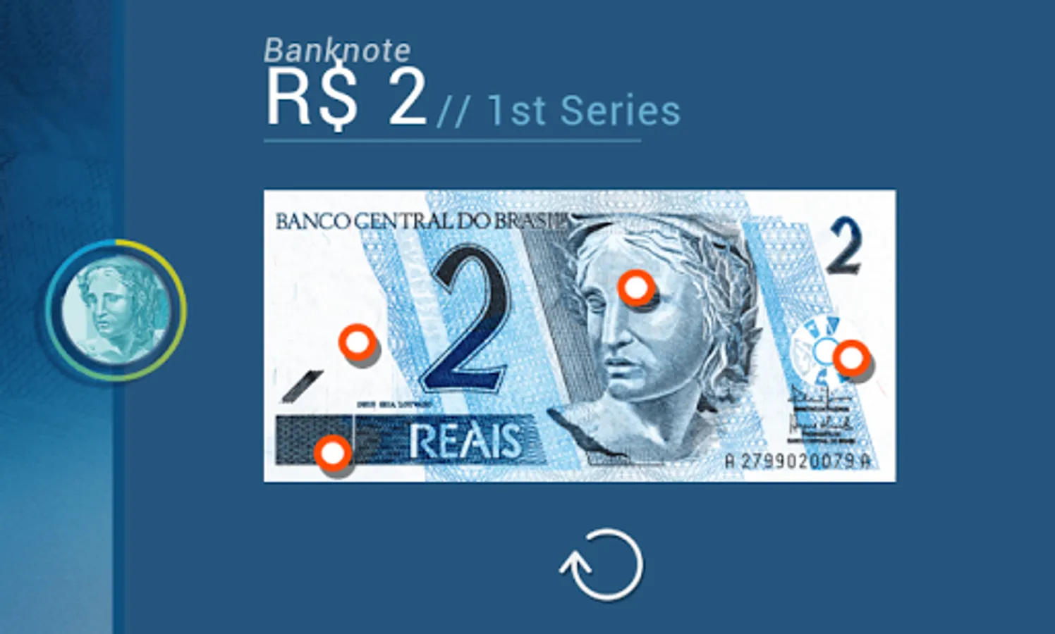 Get to know the Brazilian banknotes: learn to identify security features in the two series of the Brazilian Real. Use the camera on your device to identify a banknote or select one from the gallery. Then, see the placement and the description of each item: Watermark, Holographic Stripe, Raised Ink, Latent Image, See-Through Register, Ultraviolet Fluorescence, Colour-Changing Number and Security Thread.