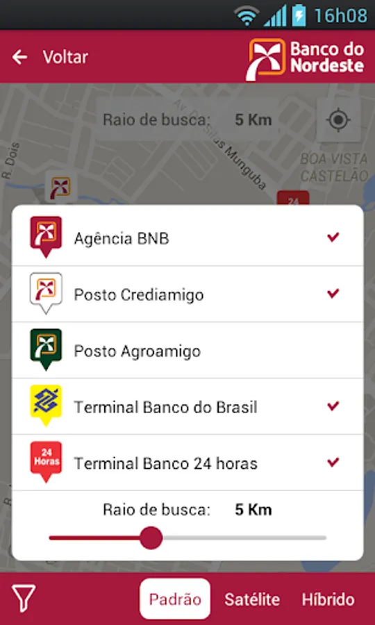 The application also offers an easy way to find out which self-service terminal of Banco do Nordeste is closest to you. Using the terminal's location feature, you have access to the exact location of branches and terminals accredited network. The feature will display the best option for you according to your location. Counting a total mapping of the Northeast Bank's service network, the application finds agencies, bank offices, Bank 24 hours and shared terminals of the Bank of Brazil.