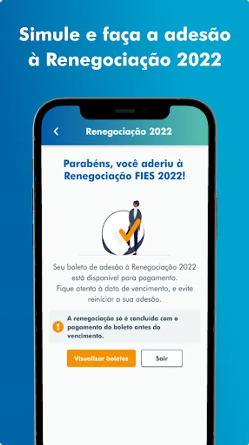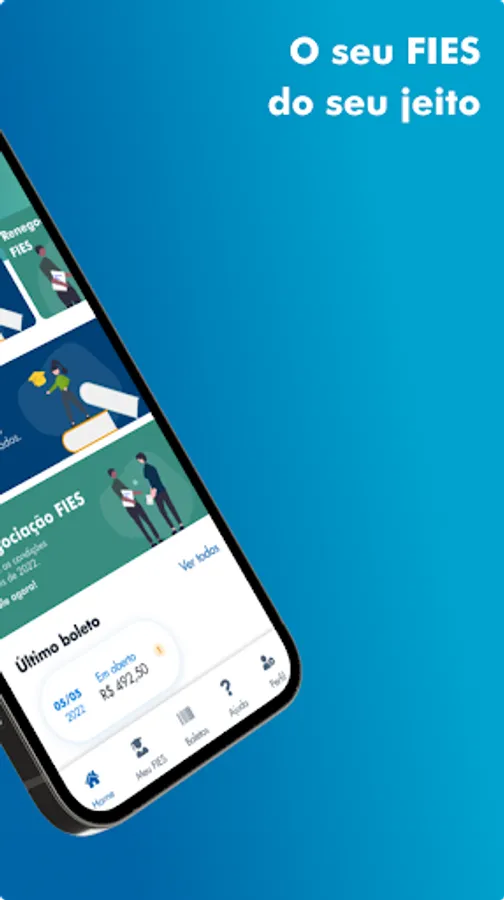 Your FIES CAIXA is now also an app. View your contract details, access slips and participate in the 2022 Renegotiation.