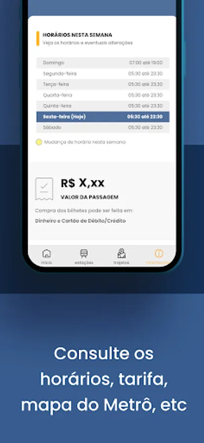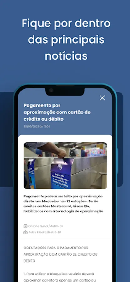 - Receive notifications about any major metro event that may impact your trip. Now the Metrô-DF will be able to communicate directly with all its users, in case of need, in an agile and efficient way;