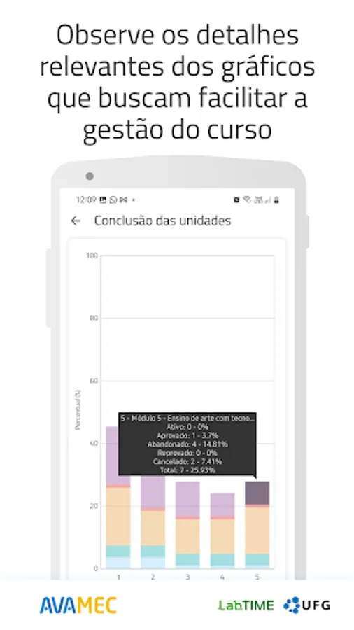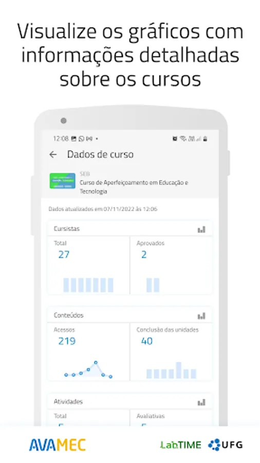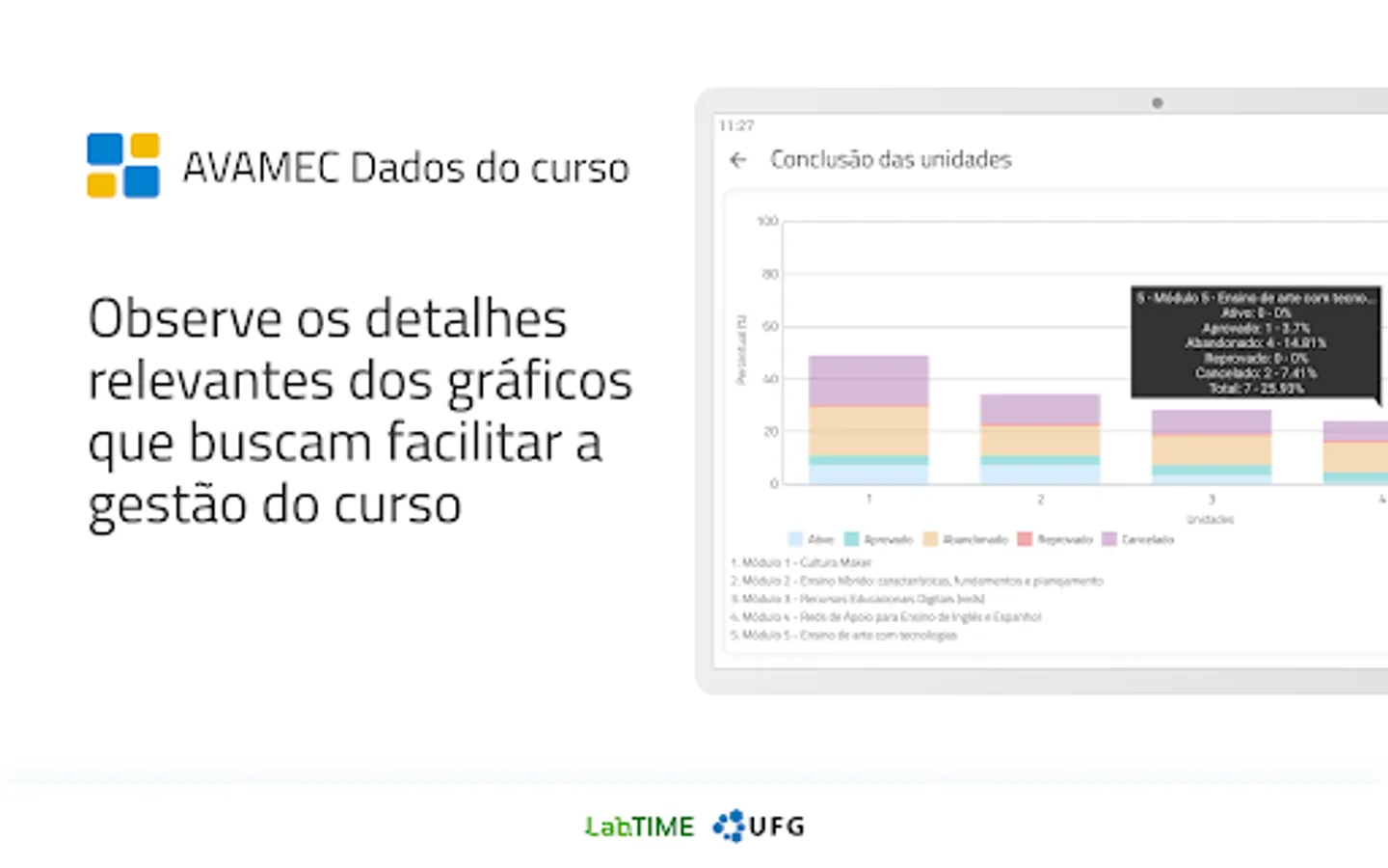The AVAMEC Course Data application allows course administrators to view graphs with some data, such as: course participants, access to content, completion of units, activities, classes and tasks. These data present relevant details that seek to facilitate, in addition to the management and monitoring of the course, decision-making.