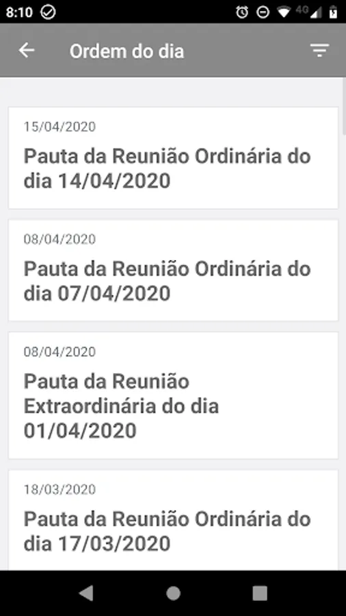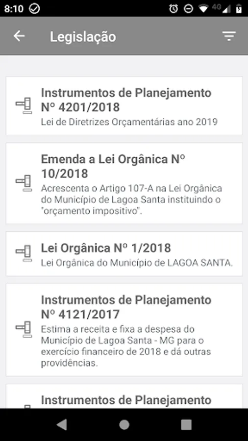 • Legislation: this item, all the Laws, Ordinances, Decrees and other municipal laws will be available in a list so that citizens can see and, if necessary, download the legislation on your smartphone.