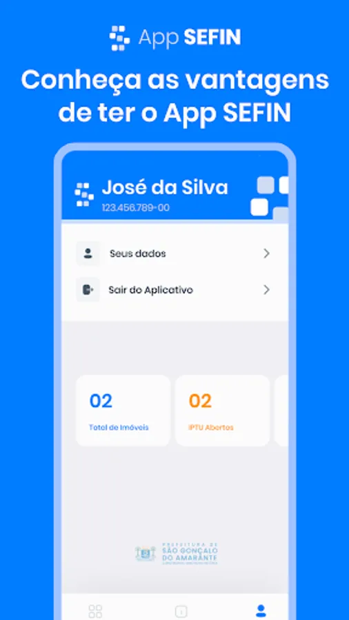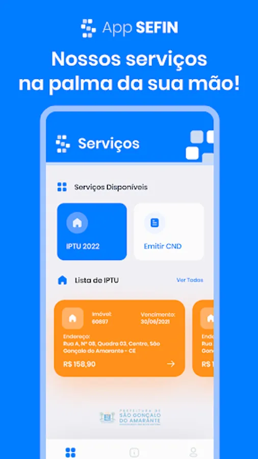 The SEFIN APP is an application that offers the main services of the Finance Department of São Gonçalo do Amarante. The application was launched on May 31, 2022 and, in principle, it offers the services of Issuing IPTU, Issuing Certificates and Issuing Single Notes.