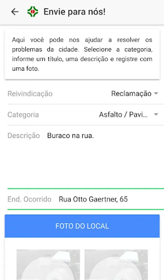 Category of the claim (asphalt, garbage collection, day care, culture among others), event description, type of claim (complaint, complaint, request, suggestion, etc.), event photo and personal data also send anonymously).
